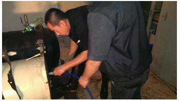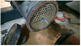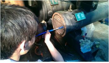 4、            打開冷凝器端蓋,用沖炮機清刷第根銅管