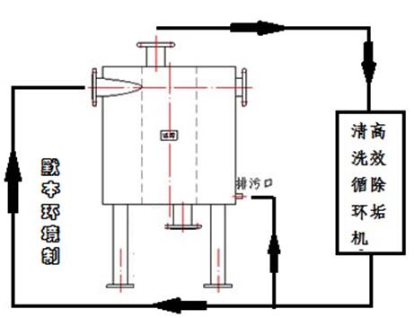 先將螺旋換熱器清洗介質的進出口閥門關閉,再將冷介質的進出口閥門關閉,排掉介質。分別以冷熱介質的進水排污口為清洗液進水口,出水排污口為清洗液出水口,按熱介質進口—熱介質出口—冷介質進口—冷介質出口的順序,和清洗泵、清洗槽、塑料管組成化學清洗循環系統