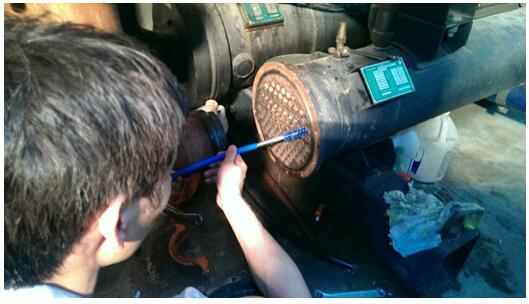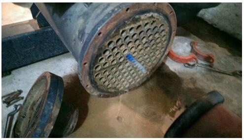 4、 打開冷凝器端蓋,用沖炮機清刷第根銅管